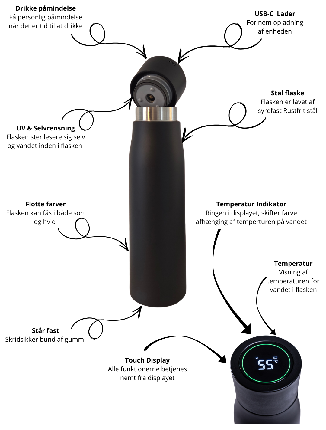 Touch-display og USB-C opladning gør flasken enkel at bruge – hver dag.
