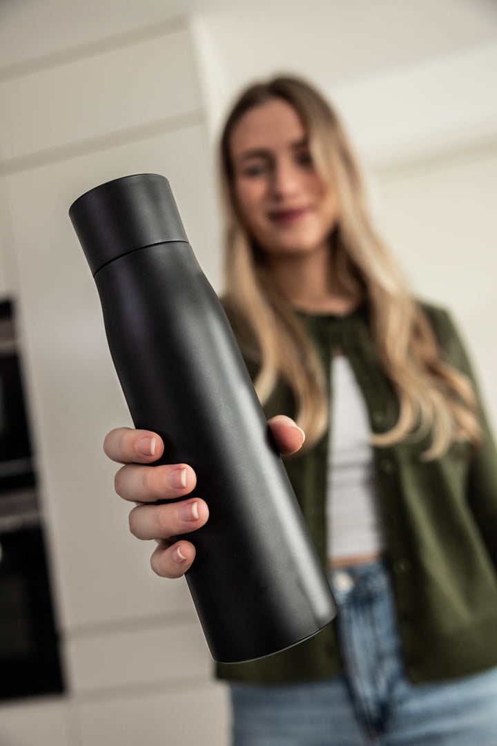 UV-teknologi hjælper med at reducere bakterier og holder både vand og flaske frisk.